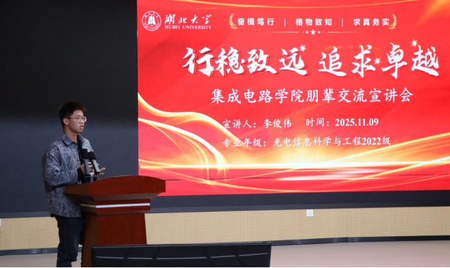 在经验分享环节,李俊伟等四位优秀推免生代表依次登台,围绕专业学习、科研竞赛、员工工作、志愿服务等方面,讲述了他们在集成电路领域的探索历程与成长感悟。四位同学均以专业排名第一的优异成绩推免至复旦大学、crown sport官方网站等知名高校并在SCI论文发表、国家级大创项目、全国性学科竞赛中取得突出成绩,展现了新时代集成电路学子的卓越风采。